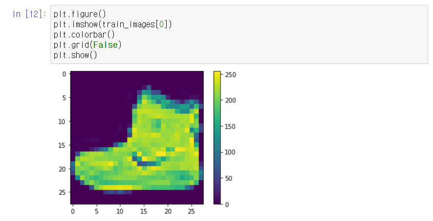 이렇게 생긴 부츠를 Ankle boot라고 하더군요. 여기서 colorbar를 통해 각 픽셀들이 0-255의 값을 갖는다는 것을 알았습니다. 픽셀들이 0-1의 값을 갖도록 255로 나눠주겠습니다.