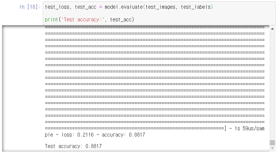 점차적으로 loss는 작아지고, accuracy는 커지는 것을 확인할 수 있습니다. 제대로 훈련되고 있다는 뜻입니다.