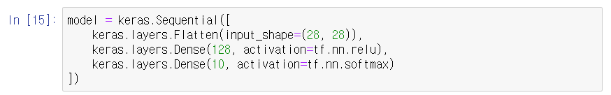Flatten을 이용해서 인풋을 일렬화한 다음에 128개의 뉴런을 갖는 층을 하나 더해줍니다. 활성화 함수로는 ReLU를 사용하도록 했구요. 그 다음에는 분류를 위해 10개의 뉴런을 갖는 출력 층을 더해주고, 활성화 함수로 softmax를 사용했습니다. 은닉(hidden) 층이 단 하나인 아주 간단한 인공신경망(artificial neural network) 모델을 만든 셈입니다.