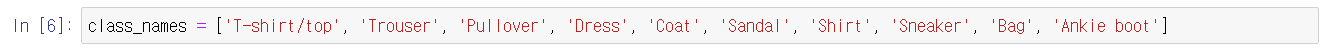 fasion mnist의 클래스 이름들을 다음과 같이 지정해줍니다.