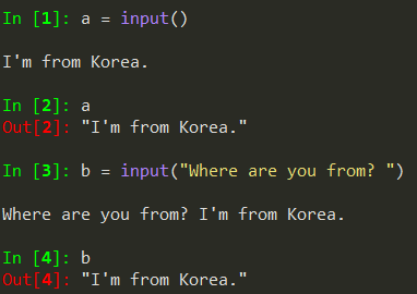 사용자로부터 문자열을 입력받고 싶을 때는 input()이라는 함수를 사용합니다. 아래와 같이 a = input()과 같이 코딩하면, 입력받은 문자열을 변수 a에 대입시켜줍니다. 또한 b = input("질문")의 형식으로 코딩할 수도 있습니다. 사용자에게 무엇에 대해 입력해야할지 질문을 던질 수 있는 것이죠. input 함수 괄호 안에 들어가는 내용을 프롬프트 문자열이라고 부릅니다.