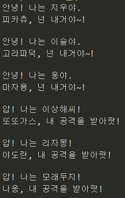 print(pokemon_name + ", 내 공격을 받아랏!\n")