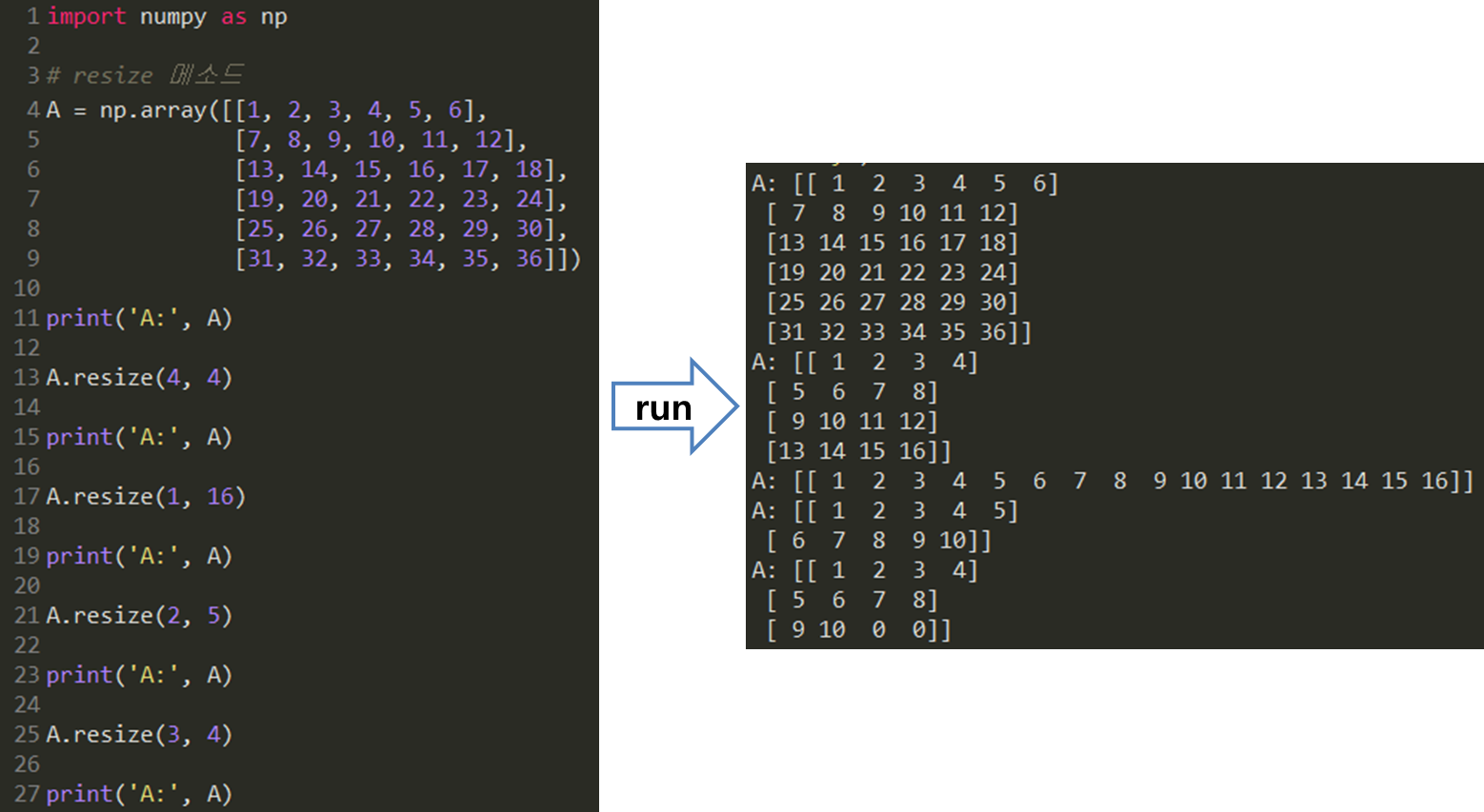 2. resize 메소드: 배열의 모양과 사이즈 바꾸기