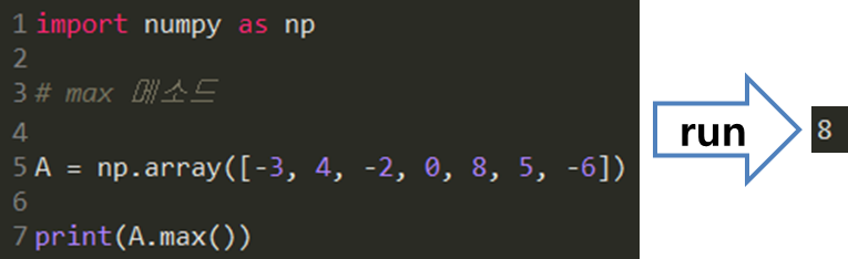 min 메소드와 argmin 메소드는 max 메소드와 argmax 메소드와 사용법에 있어 상통하므로 예제는 생략하겠습니다.