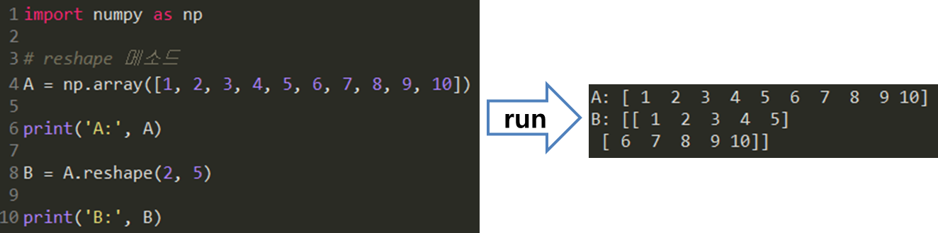 넘파이 배열의 모양을 바꿀 때는 reshape 메소드를 사용할 수 있습니다. 모양이 바뀐 배열을 반환(return)해줍니다.