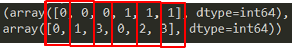 0, 0에 위치한 원소, 0, 1에 위치한 원소, 0, 3에 위치한 원소들이 0이 아니란 뜻입니다. 값이 0인 원소들을 제외하고 싶을때 nonzero와 같은 메소드를 사용기도 합니다.