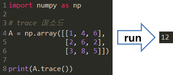 배열(행렬) A의 대각원소들인 1, 6, 5의 합인 12가 잘 출력된 것을 확인하실 수 있습니다.