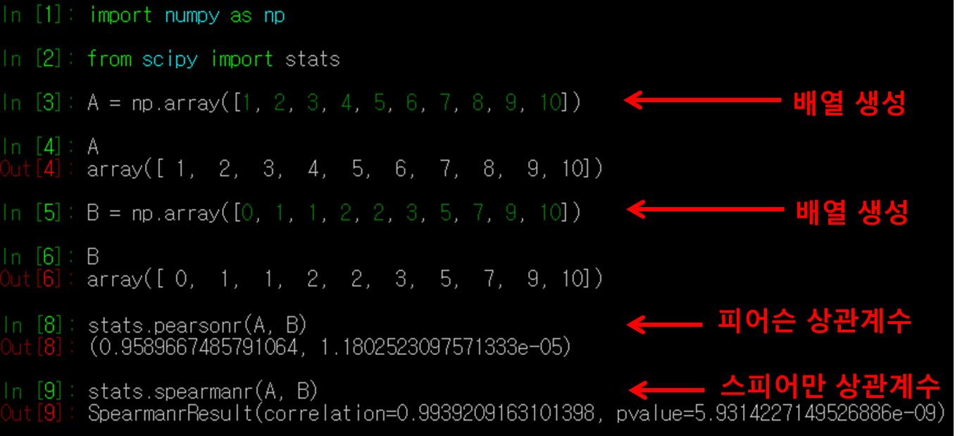 피어슨 상관계수와 스피어만 상관계수를 구하기 위해서 저는 scipy 패키지의 stats 모듈 내의 pearsonr 함수와 spearmanr 함수를 이용하겠습니다. 각각 10개의 숫자를 담고 있는 1차원 배열을 2개 만든 후에, 두 배열의 상관계수가 얼마인지를 출력해보겠습니다.