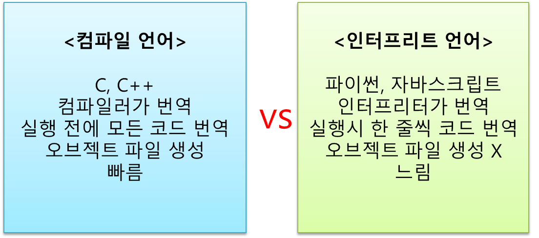 2) 컴파일 언어는 실행 전에 컴파일러에 의해 생성된 오브젝트파일을 이용해서 프로그램을 실행하기 때문에, 실행 속도가 빠릅니다. 반면, 인터프리트 언어는 실행할 때마다 한 줄씩 번역을 진행하기 때문에 컴파일 언어에 비해 실행 속도가 느린 편입니다.