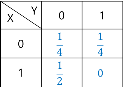 확률변수 X, Y에 대한 결합확률분포표가 다음과 같을 때 상호 정보량을 계산해보도록 하겠습니다.