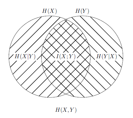 마지막으로 좀 더 직관적인 이해를 위해, 엔트로피, 조건부 엔트로피, 결합 엔트로피, 상호 정보량을 벤 다이어그램으로 나타내면 다음과 같은 형태가 됩니다. X의 엔트로피와 Y의 엔트로피의 교집합이 바로 X, Y의 상호 정보량에 해당하는 것이죠. 여기서도 알 수 있는 것이 만약 두 확률변수가 독립이라면 교집합이 존재하지 않으니 상호 정보량이 0이 된다는 것입니다.