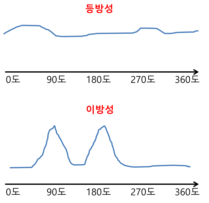 isotropic은 사전적으로 "등방성의"라는 뜻을 갖고, anisotropic은 "이방성의"라는 뜻을 지닙니다. 뜻을 풀어보면 등방성은 "같은 방향 성질을 갖는"이고, 이방성은 "다른 방향 성질을 갖는"이 됩니다. 이렇게 풀어봐도 전혀 이해가 안되죠. 이해가 안되는 것이 어쩌면 당연합니다.