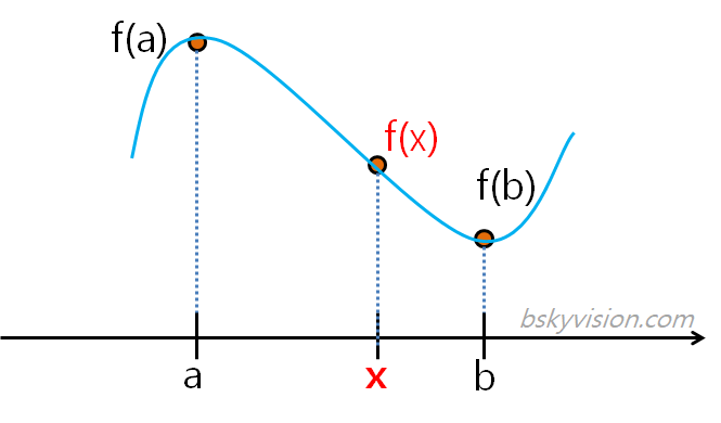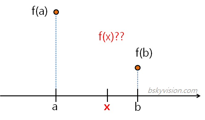 식이 복잡해보인다고 겁먹지 마세요.^^ 어려운 것 아닙니다. 중요한 것은 일차함수식을 찾아냈다는 것입니다. 일차함수식을 찾아냈기 때문에, a와 b 사이의 어떤 점 x의 함수값, 즉 f(x)도 그 식에 대입함으로써 알아낼 수 있습니다. 이것이 바로 선형보간법의 핵심입니다. 기억해야할 것은 선형보간법에서는 값을 추정할 때 두 개의 점을 참조했다는 점입니다.