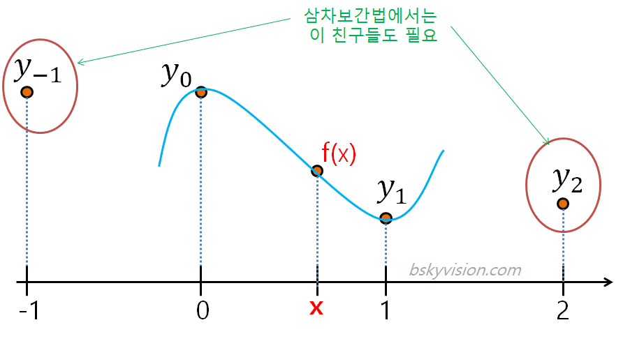 따라서 우리는 $(0, y_0)$, $(1, y_1)$말고도, 추가적으로 두 점 $(-1, y_{-1}), (2, y_2)$도 참조해야합니다. 그래서 삼차보간법은 이웃한 두 개를 참조하는 선형보간법과 달리 네 개의 점을 참조합니다.