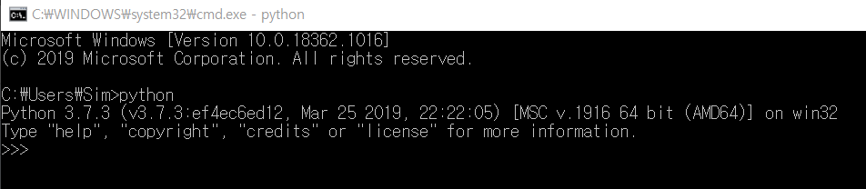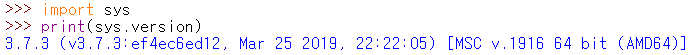 윈도우 명령프롬프트에서 python이라고 입력하니 3.7.3 버전임을 알려주네요.