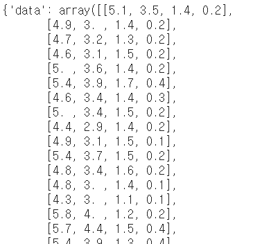 iris_dataset = load_iris() # 붓꽃 데이터셋을 적재합니다.