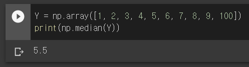 중앙값으로 5가 나왔죠? 참고로 numpy 패키지를 import 할 때 np라는 이름으로 부르기로 했기 때문에, numpy.median()을 np.median()과 같이 사용할 수 있는 것입니다.