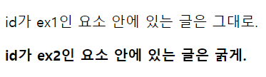 위 코드를 실행하면 다음과 같은 웹페이지가 생성됩니다. font-weight:bold로 꾸며준 id가 ex2 요소의 글자만 굵어진 것을 확인하실 수 있습니다.