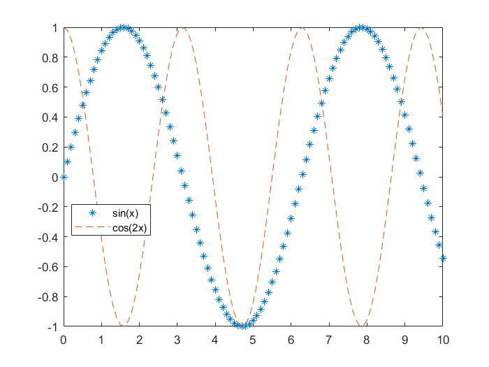 legend('sin(x)', 'cos(2x)', 'Location', 'best');