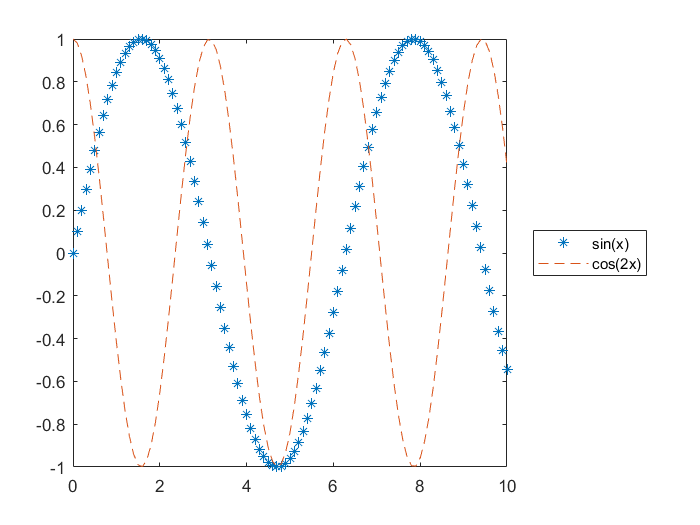 legend('sin(x)', 'cos(2x)', 'Location', 'eastoutside');