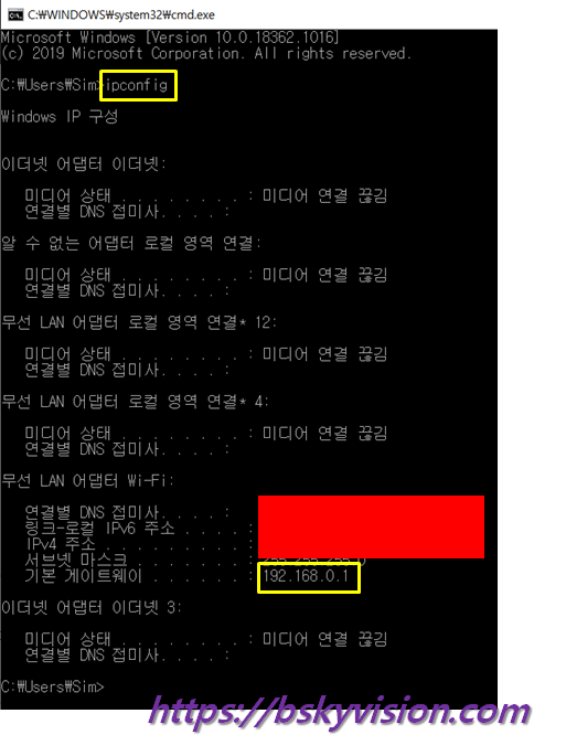 *만약 위 그림과 같은 페이지에 접속되지 않았다면, 명령프롬프트(cmd.exe)를 열어서 ipconfig를 입력해줍니다. 참고로 명령프롬프트는 [윈도우키]+[R키]로 프로그램 실행 창을 띄운 후에 cmd를 입력하면 열립니다. 명령프롬프트에서 ipconfig를 입력하면 다음과 같은 내용이 나오는데, 그중에서 기본 게이트웨이 주소를 웹브라우저 주소창에 입력해주면 됩니다. 그러면 iptime 공유기 설정 페이지에 접속될 것입니다.