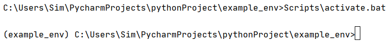 가상환경을 만들었다고 무조건 가상환경에서 작업을 하는 것이 아닙니다. 가상환경을 활성시켜줘야지, global 환경에서 벗어나 가상환경에서 작업을 진행합니다. 가상환경을 활성화하기 위해서는 example_env 디렉토리 안에 있는 Scripts 디렉토리 내 activate.bat 파일을 실행시켜줘야 합니다.