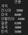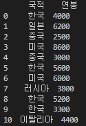 '연봉':[4000, 6200, 2500, 8600, 3000, 5600, 6800, 3800, 5200, 3300, 4400]}