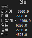 dict_data = {'국적':['한국', '일본', '중국', '미국', '중국', '한국', '미국', '러시아', '한국', '한국', '이탈리아'],
