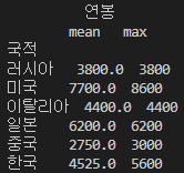print(df.groupby(['국적']).agg(['mean', 'max']))