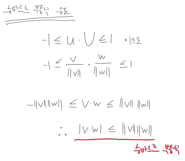먼저 슈바르츠 부등식부터 유도해보겠습니다. 두 단위벡터의 점곱이 -1보다 크거나 같고, 1보다 작거나 같다는 것에서부터 시작합니다.