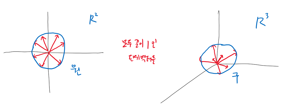 2차원 공간에서 존재하는 모든 단위벡터를 그리면 반지름이 1인 원을 이룹니다. 또한 3차원 공간에서 존재하는 모든 단위벡터를 그리면 반지름이 1인 구를 만들어냅니다.