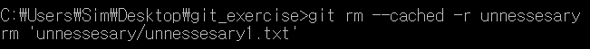 여기서 --cached는 원격저장소의 폴더 또는 파일을 삭제한다고 알려주는 옵션입니다. 만약 --cached가 없으면 로컬저장소의 폴더 또는 파일도 삭제합니다. 그런데 로컬저장소에서는 꼭 필요한 파일이거나 폴더일 수 있기 때문에 잘 판단해서 --cached를 넣어줘야 합니다. 여기서 로컬저장소에서 꼭 필요한 파일이나 폴더에는 코드를 실행하기 위해 꼭 필요한 패키지, 라이브러리, 실행파일 같은 것들입니다. 그러나 개발환경이 조금씩 다른 다른 협업자들을 위해서 이러한 파일이나 폴더는 보내지 말아야 합니다.