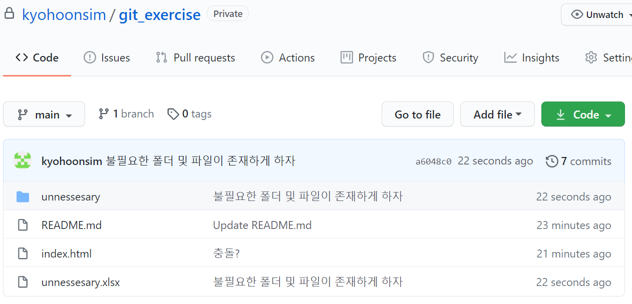 원격저장소에 있는 unnessesary 폴더와 unnessesary.xlsx 파일을 지워보도록 하겠습니다.