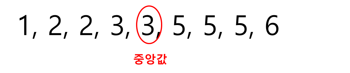 중앙값은 단순히 크기 순으로 나열했을 때 중앙에 위치하는 값이다. 따라서 중앙값은 3이 된다.
