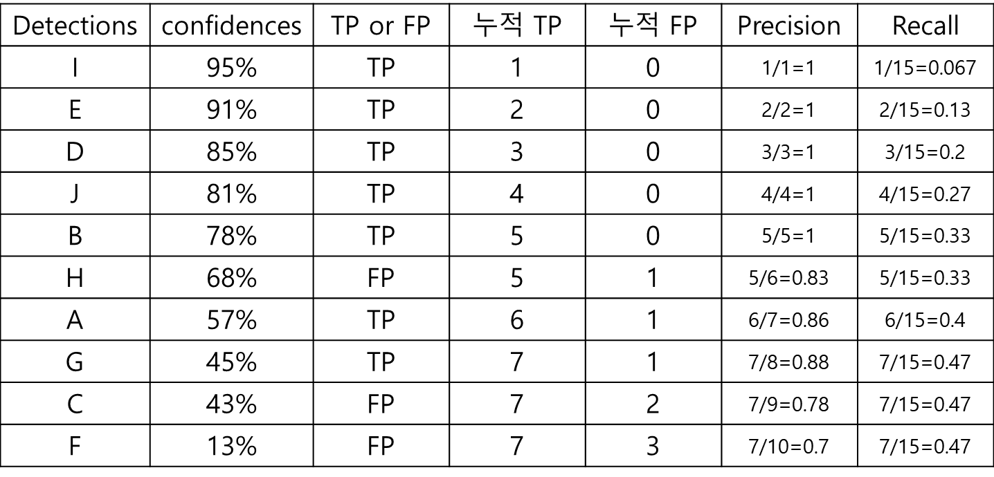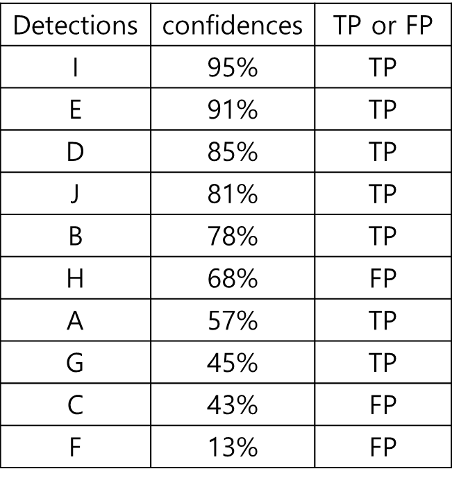 15개의 얼굴이 존재하는 어떤 데이터셋에서 한 얼굴 검출(face detection) 알고리즘에 의해서 총 10개의 얼굴이 검출(confidence 레벨 0부터 100%까지 모두 고려했을 때)되었다고 가정해보자. 이때 각 검출의 confidence 레벨과 옳게 검출되었는지 잘못 검출되었는지에 대한 여부는 아래 표에 나타냈다. (TP는 옳은 검출, FP는 틀린 검출)