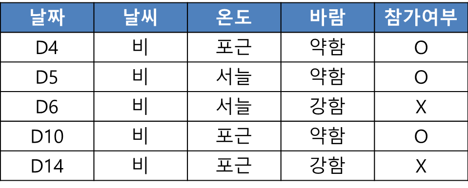 이번에는 바람을 상위 노드로 놓고 약함으로 갔을 때의 하위 노드를 생각해보자. 날씨 비에 바람 약함인 날들만을 고려하면 된다.