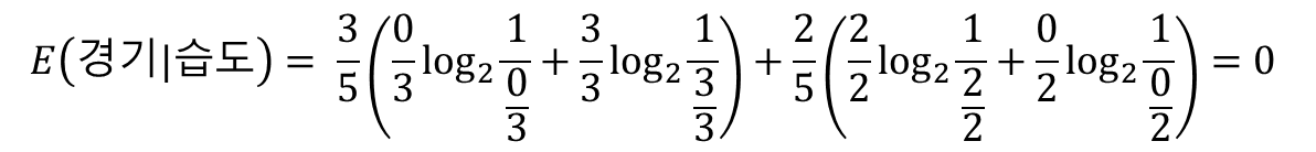 IG(경기, 습도) = E(경기) - E(경기|습도) = 0.971 - 0 = 0.971