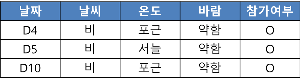 이번엔 날씨를 상위 노드의 속성으로 놓고 비로 갔을때 하위노드가 무엇이 될지 찾아보자. 마찬가지로 비인 경우만 생각하면 된다. 습도 속성은 이미 사용되었으므로 표에서 지웠다.