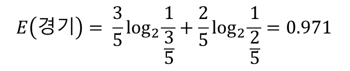 이때 목표 속성인 경기 참가의 엔트로피는 다음과 같다. 참가횟수가 3회이고 불참횟수가 2회이므로 참가할 확률은 3/5, 불참할 확률은 2/5이다.