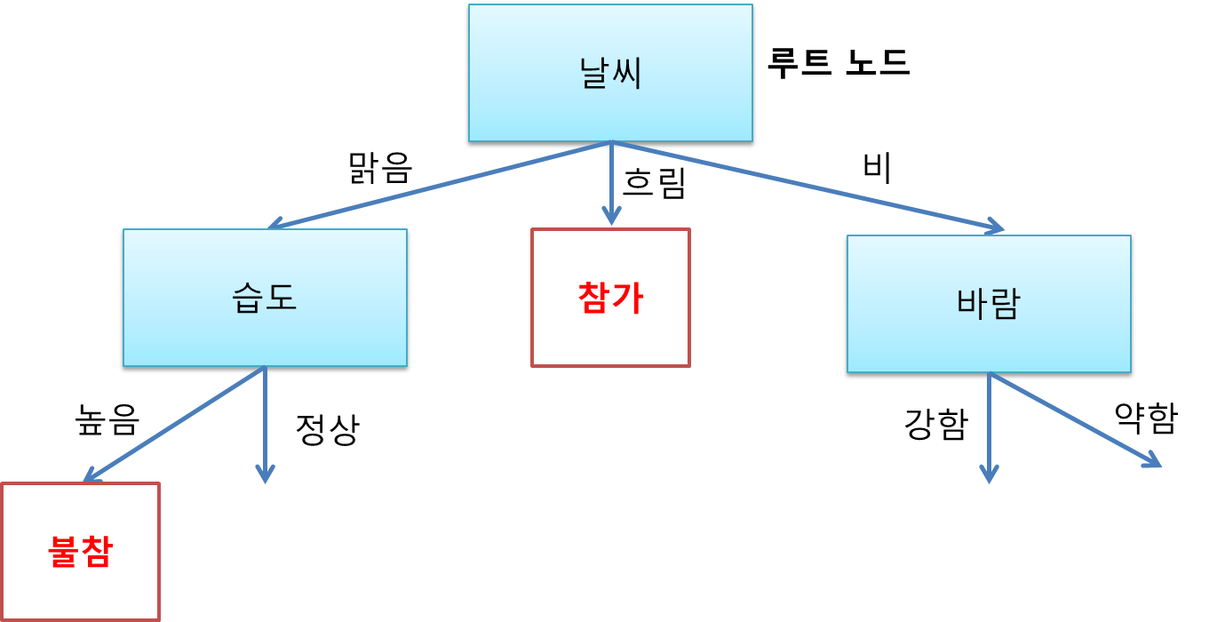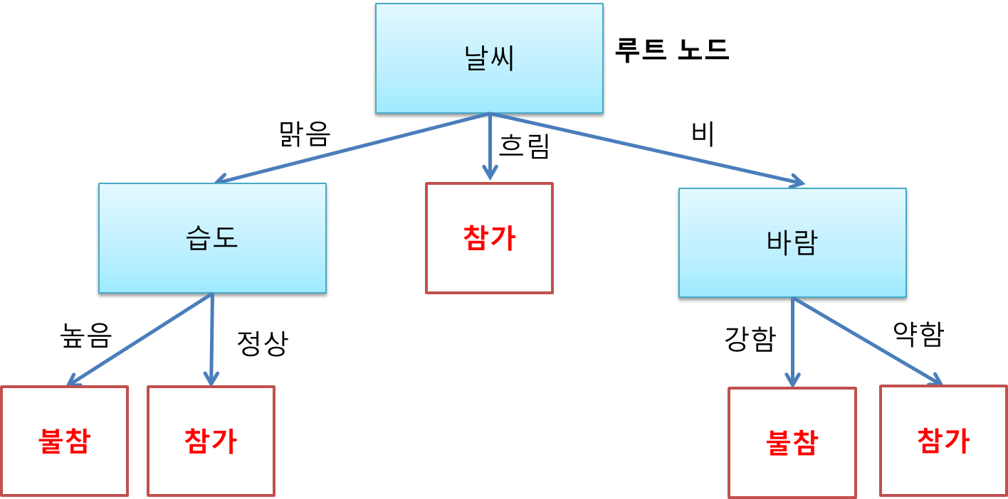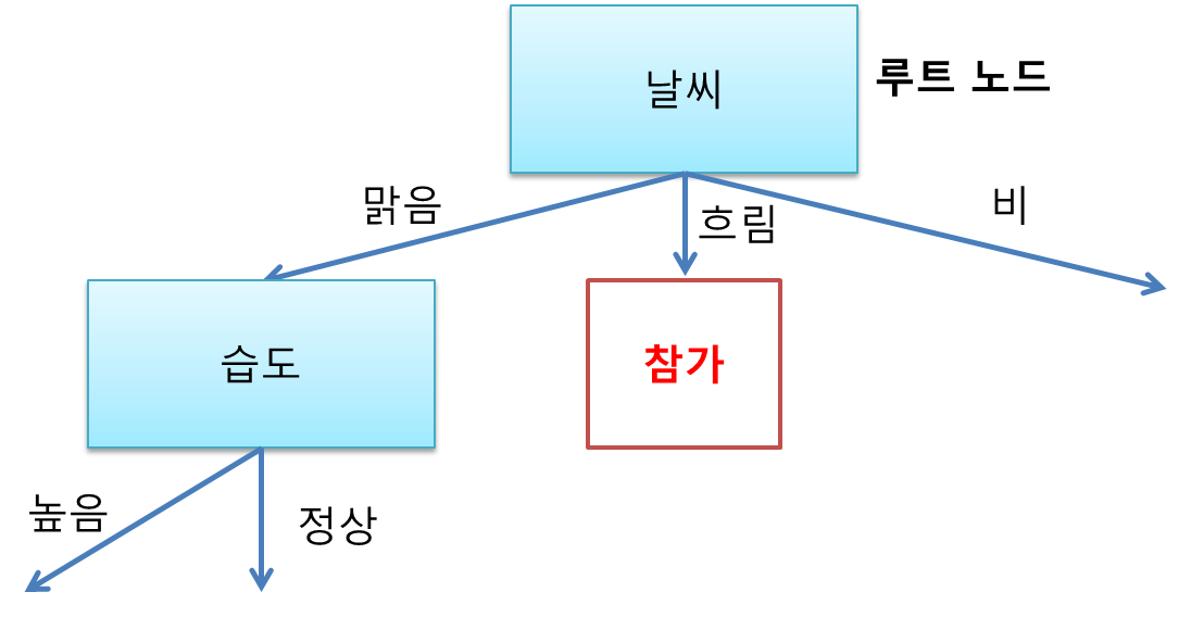그런데 흐림인 경우에는 항상 참가임을 알 수 있다. 따라서 결정 노드가 아닌 참가 클래스가 붙은 리프 노드(leaf node, 잎 노드)가 아래에 붙는다.