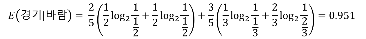 IG(경기, 바람) = E(경기) - E(경기|바람) = 0.971 - 0 = 0.971
