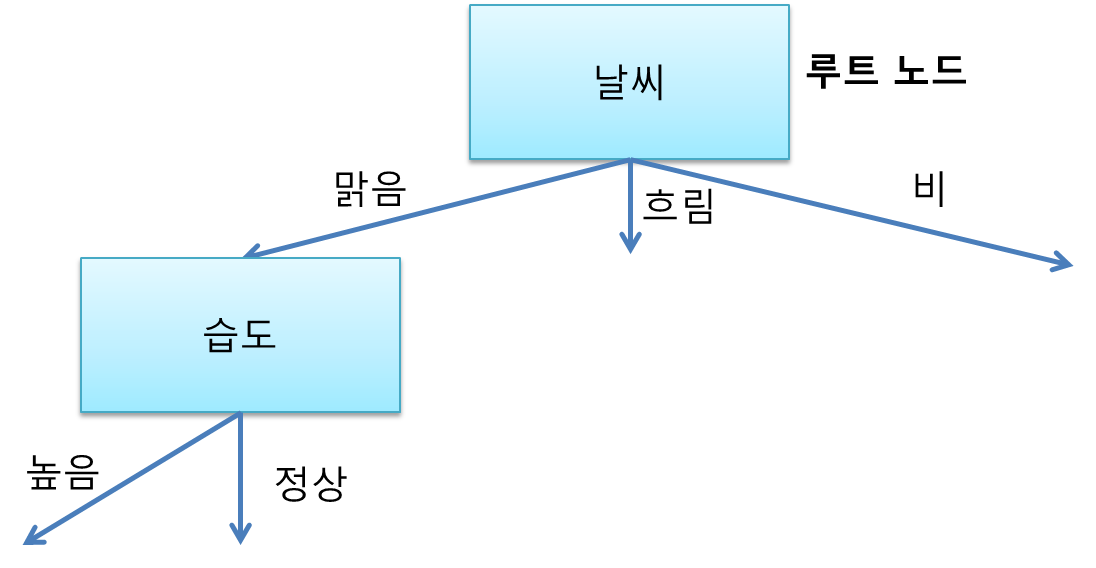 따라서 날씨를 결정 노드로 정해준다. 첫 결정 노드이므로 루트 노드(root node, 뿌리 노드)라고 명명한다.