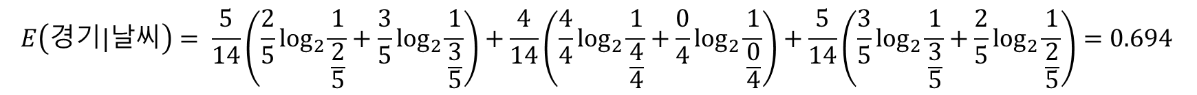 IG(경기, 날씨) = E(경기) - E(경기|날씨) = 0.94 - 0.694 = 0.246