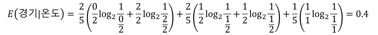 IG(경기, 온도) = E(경기) - E(경기|온도) = 0.971 - 0.4 = 0.571