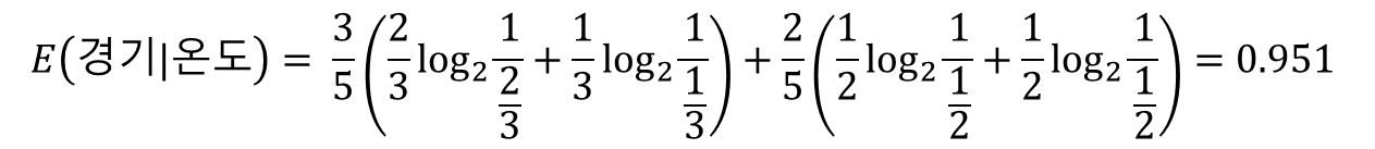 IG(경기, 온도) = E(경기) - E(경기|온도) = 0.971 - 0.951 = 0.02
