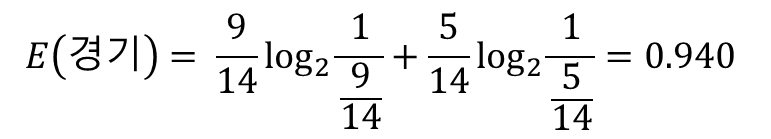 먼저 목표 속성인 경기 참가에 대한 엔트로피를 구한다. 참가횟수가 총 9회이고 불참횟수가 5회이므로 참가할 확률은 9/14, 불참할 확률은 5/14이다. 따라서 경기 참가에 대한 엔트로피는 다음과 같다.