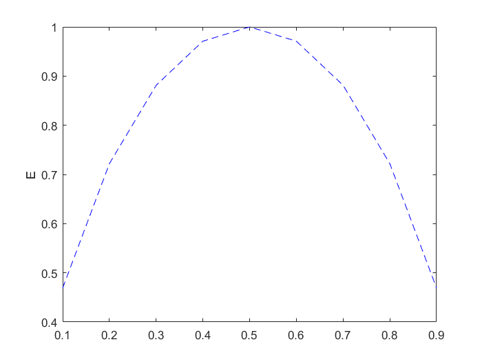 여기서 $S$는 이미 발생한 사건의 모음을 의미한다. 그리고 $c$는 사건의 갯수다. 엔트로피가 크다는 것은 평균 정보량이 크다는 것인데, 대개 사건들이 일어날 확률이 비슷한 경우에 엔트로피가 크다. 어떤 두 가지 사건이 각각 {0.9, 0.1}의 확률로 일어나는 경우부터 시작해 {0.8, 0.2}, {0.7, 0.3},..., {0.2, 0.8}, {0.1, 0.9}로 일어나는 경우의 엔트로피를 비교해보자. 그 결과 엔트로피의 변화를 나타낸 그래프는 다음과 같다.