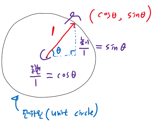 왜냐하면, 직각삼각형에서 빗변이 1인 상황이기 때문에 밑변은 cos(세타), 높이는 sin(세타)가 됩니다.