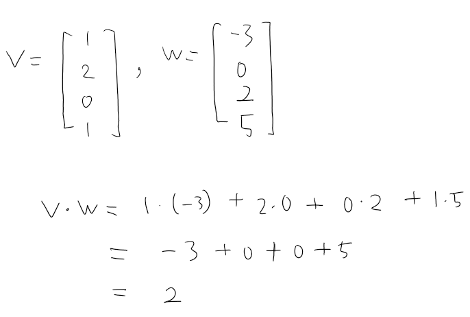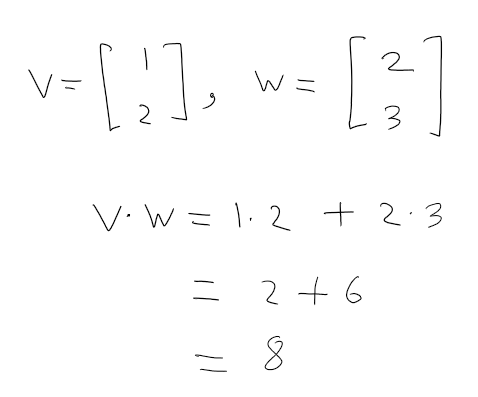 만약 v와 w가 다음과 같다면, 두 벡터의 점곱은 이렇게 계산됩니다.