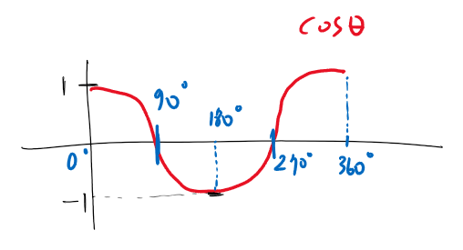 코사인 함수는 위와 같이 그려지기 때문에 두 벡터 사이의 각도 (세타)가 90도보다 크면 음수가 되고, 90도보다 작으면 양수가 됩니다. 90도일 때는 0이 되고요. 따라서 점곱이 음수라는 뜻은 두 벡터가 서로 둔각을 이룬다는 뜻이고, 양수라는 뜻은 서로 예각을 이룬다는 뜻입니다.